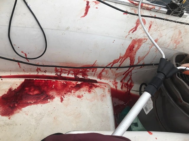 尻尾とエラ元を切って、ストリンガーに吊るし、海にポチャリ。