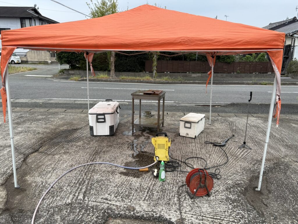 私の場合、実家の庭にイベント用のテントを張って、即席の下処理場を作ります。