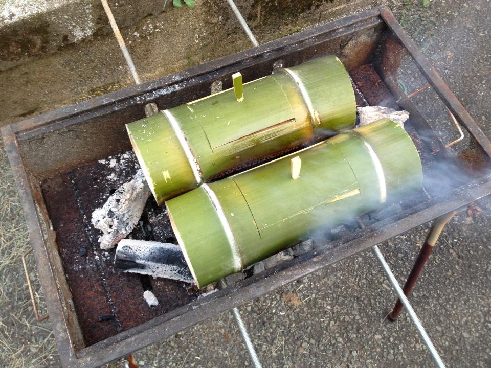 わが家では、私が先日テレビ番組で紹介した**「たかんぽ飯」**(竹筒炊飯)を実演しました。