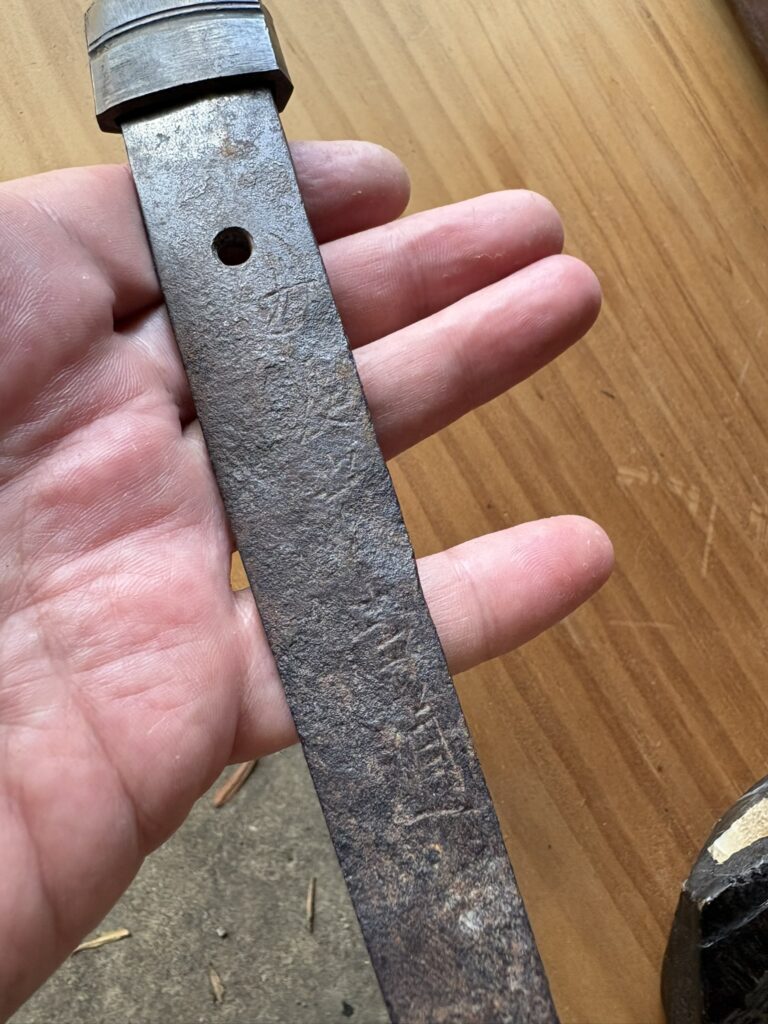 The tang (nakago) of the blade, still bearing faint markings.