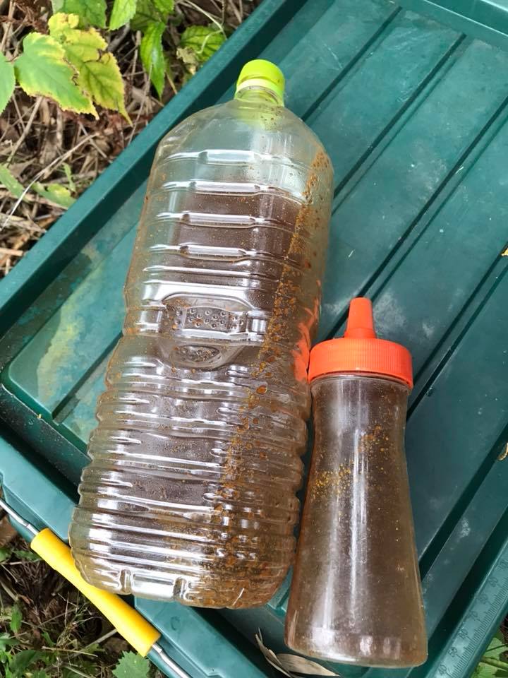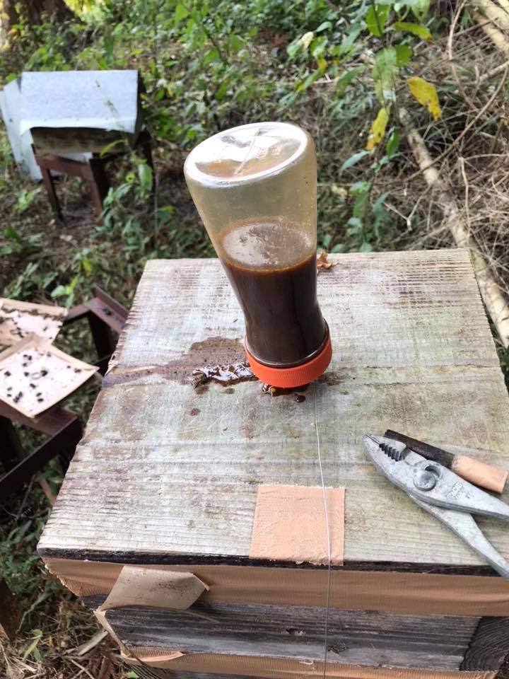蜂蜜の残りを入れた給餌瓶 / Honey residue feeder for winter bees