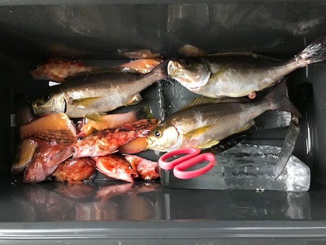 • クーラーボックス内 – Cooler box with today’s catch, including isaki and rockfish.