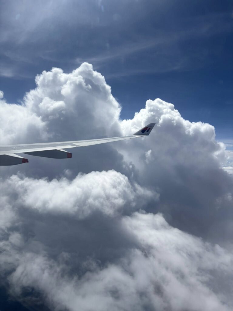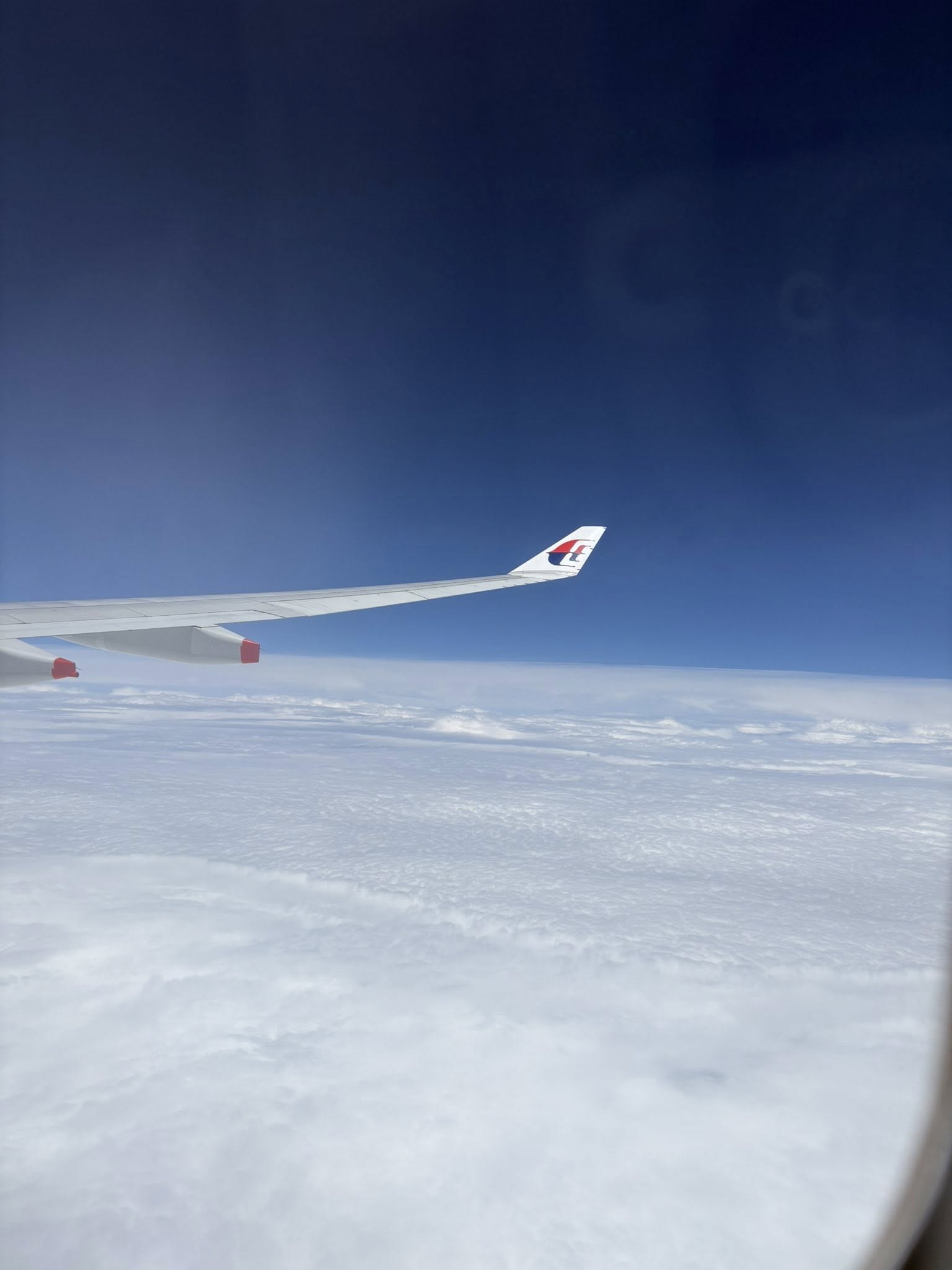 Departing from Kansai International Airport for Kuala Lumpur — a 7-hour journey above tropical clouds.