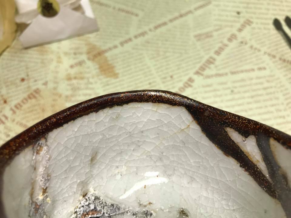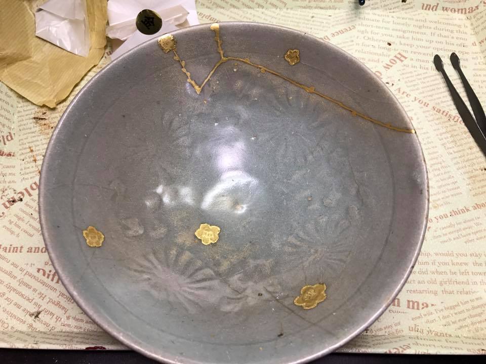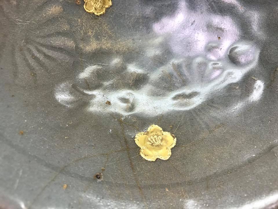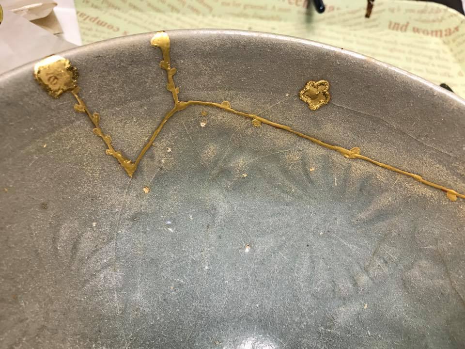 高麗青磁は、釉薬が剥げた部分を本漆と砥の粉で埋め、