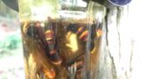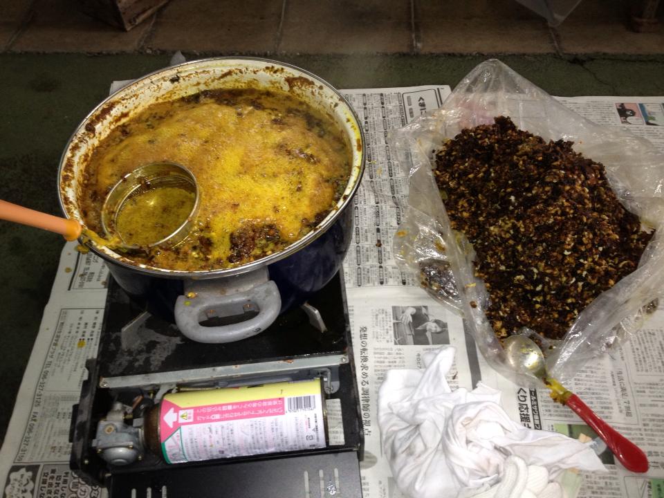 先日採蜜を終えた日本ミツバチの巣の残渣を鍋に入れ、