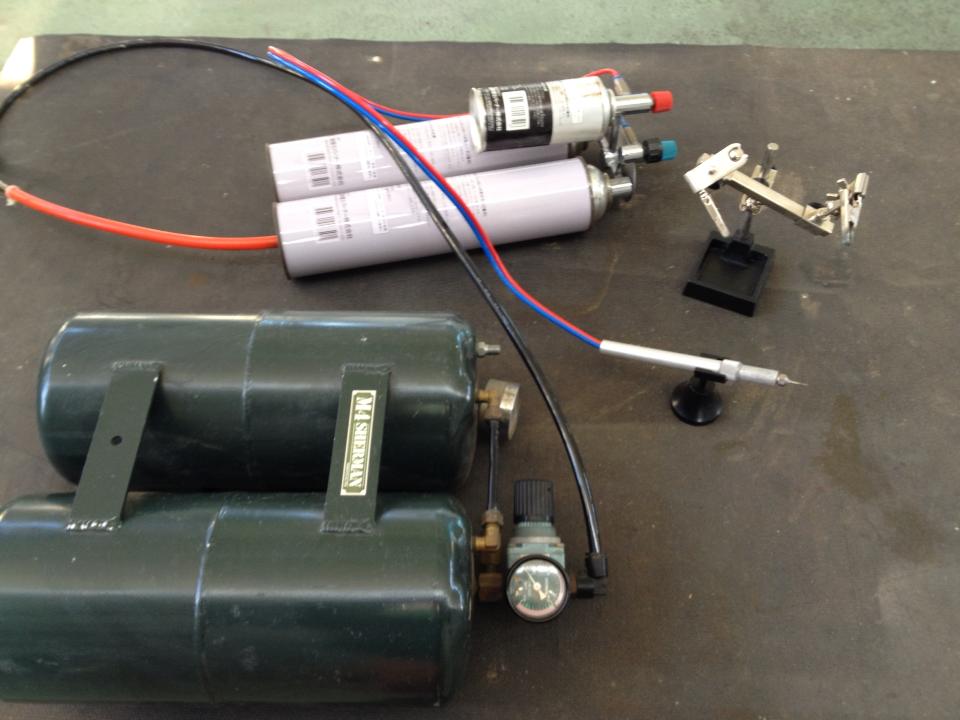 今回はちょっと工夫をして、大型溶接機の酸素ボンベから補充して使っています。