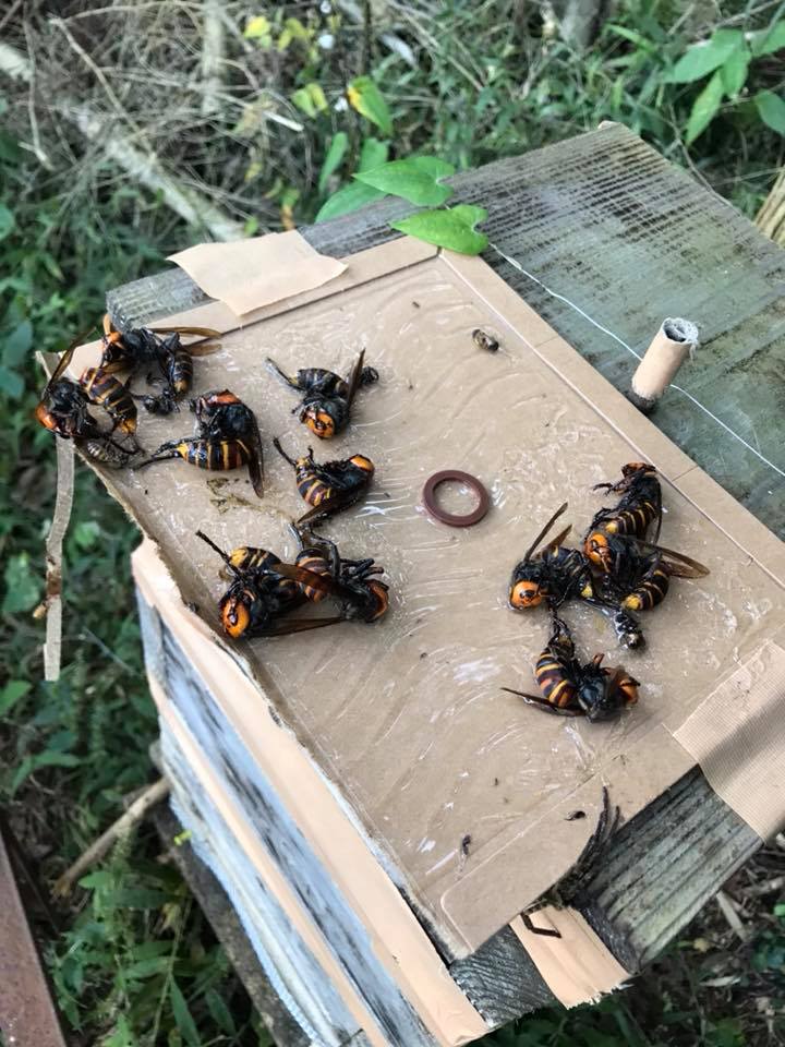 一匹のオオスズメバチを叩き落とし、ネズミホイホイに貼りつけて巣のそばに置いておくと、