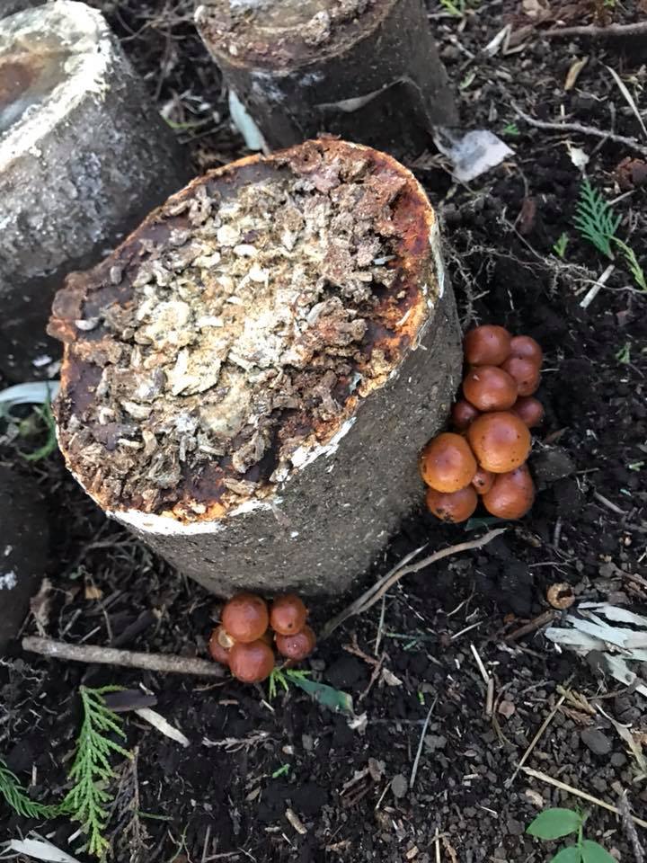 着床させていた原木の様子を見に行くと、ナメコがちょうど顔を出していました。