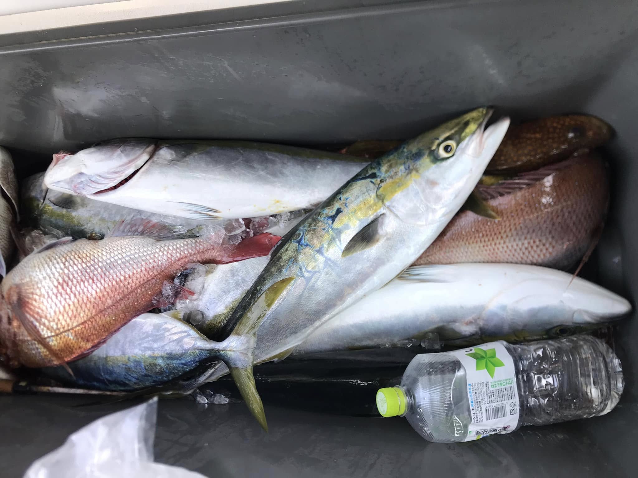 3〜4キロのブリが7.8匹、3キロ位の真鯛が3.4匹の他、全身大トロのスマガツオやハタ類が、釣れました。(写真のペットボトルは2リットルサイズです、)