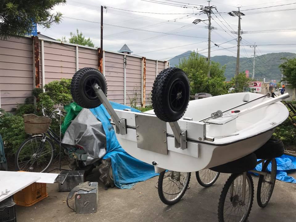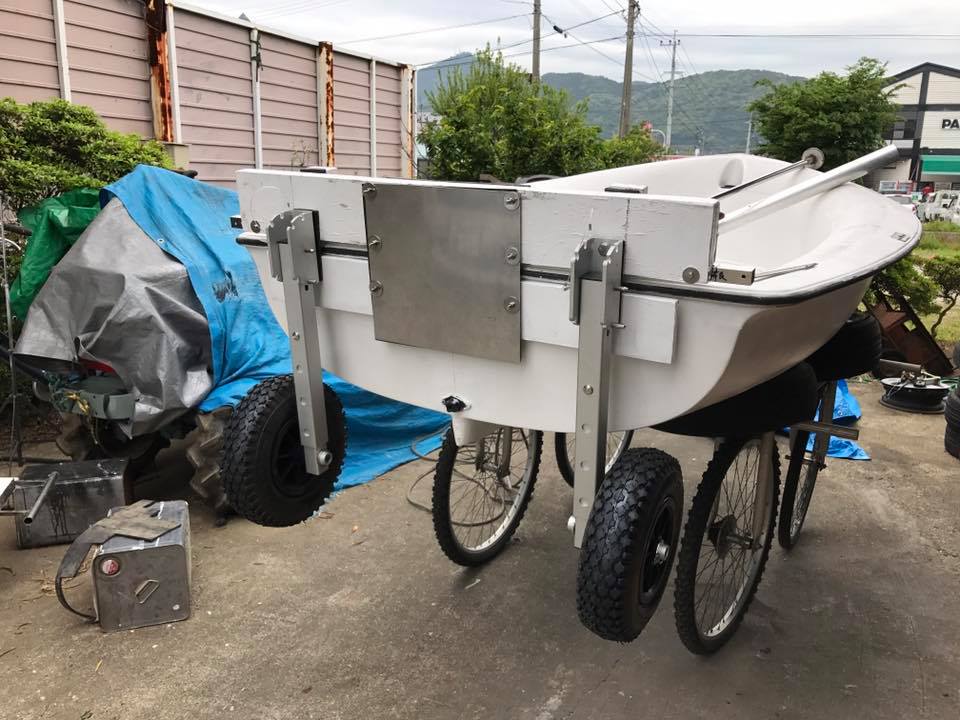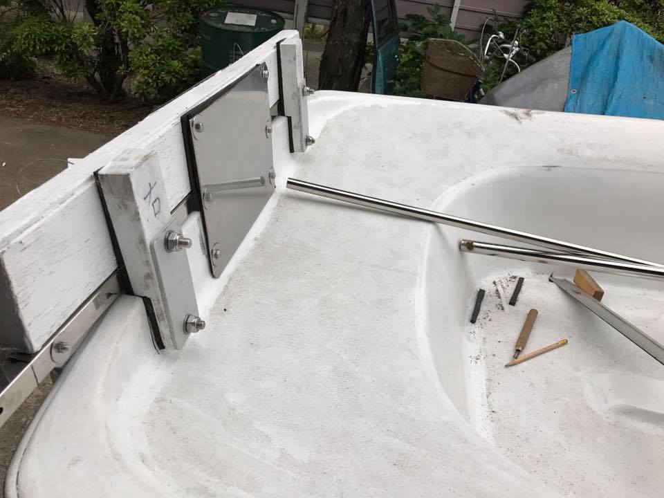 パワー船外機を積む為に、トランサム(船尾の壁)をステンレスで強化して、1人で運搬出来るようにドーリー(タイヤ)を付けました。