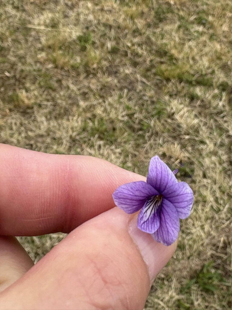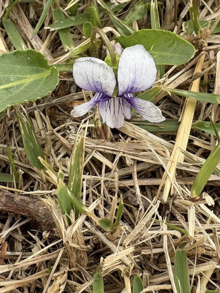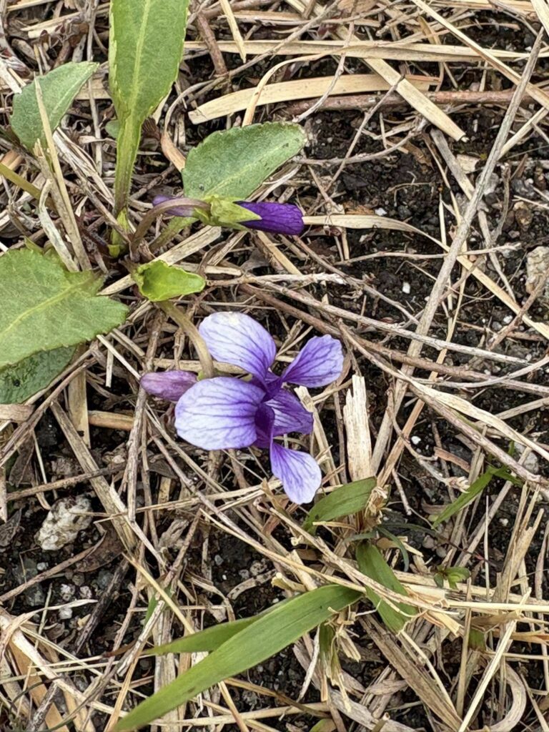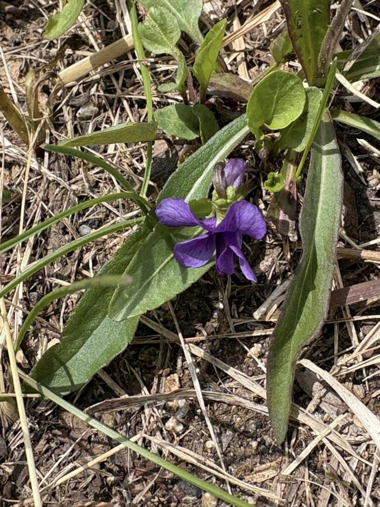 足を止めて探してみると、草むらの中に小さなスミレが咲いていました。