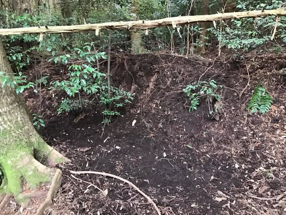 キノコ圃場とミツバチ集落の奥を歩いていると、やけに荒れた地面と、