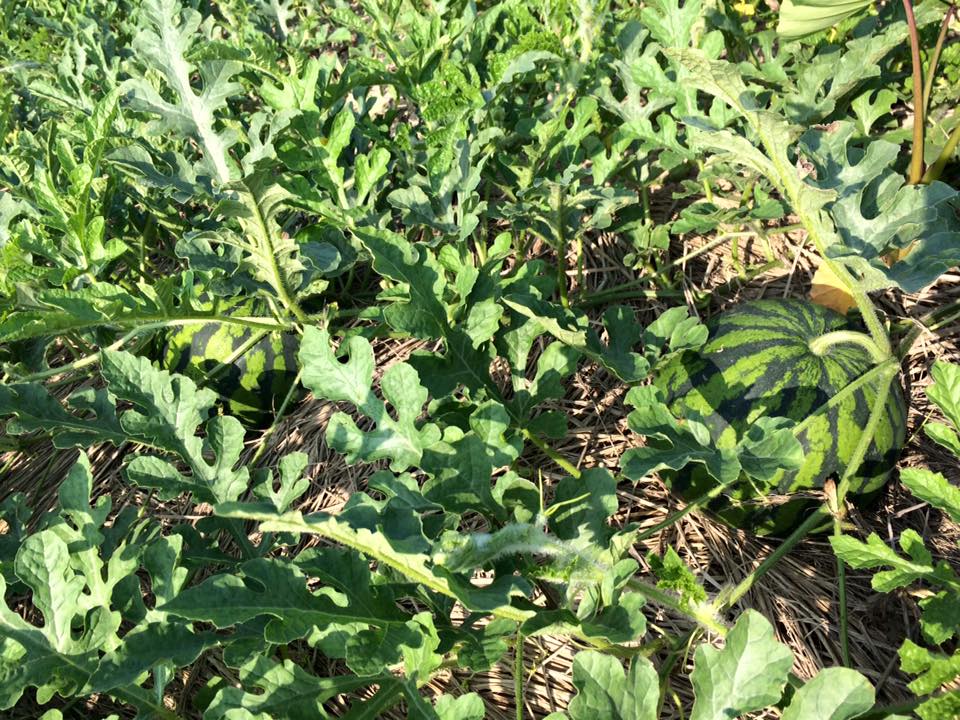 Protected by netting to keep crows away, these watermelons thrive in the heat.